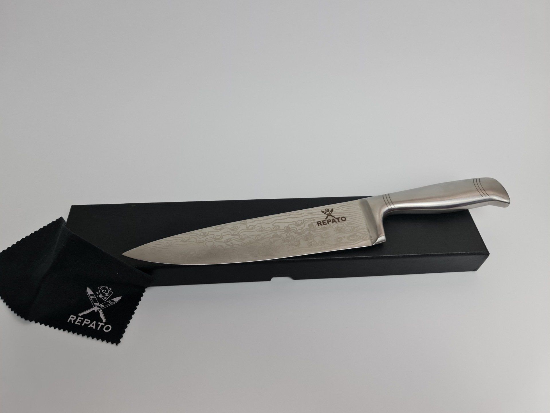 Das Repato Chefmesser Anja hat einen Metallgriff. Das Messer ist aus einem Stück Metall gefertigt. Das hat den Vorteil, dass es sehr gut ausbalanciert ist. Es ist also hervorragend zu führen. Ein weiterer Vorteil des Metallgriffs ist auch, das er keine Kanten hat und somit keinen Raum für Schmutz und Bakterien bietet. Der Edelstahlgriff ist günstig, lässt sich einfach in der Spülmaschine reinigen, und ist somit sehr hygienisch.